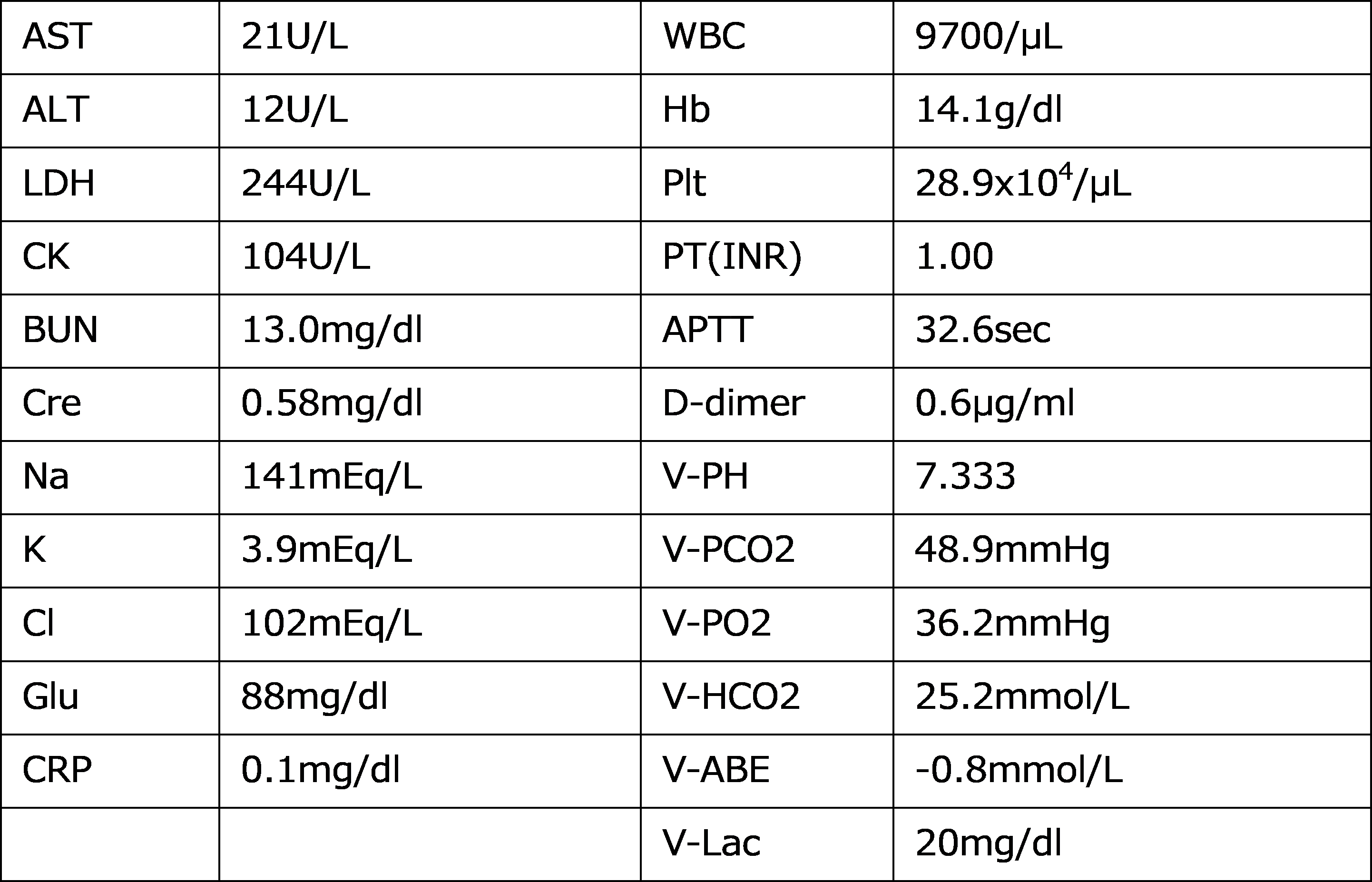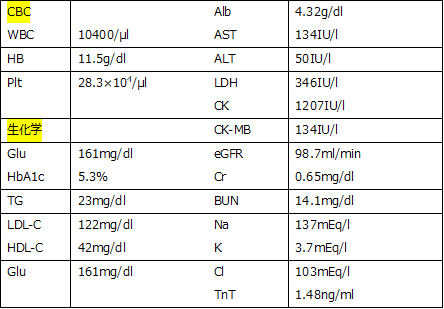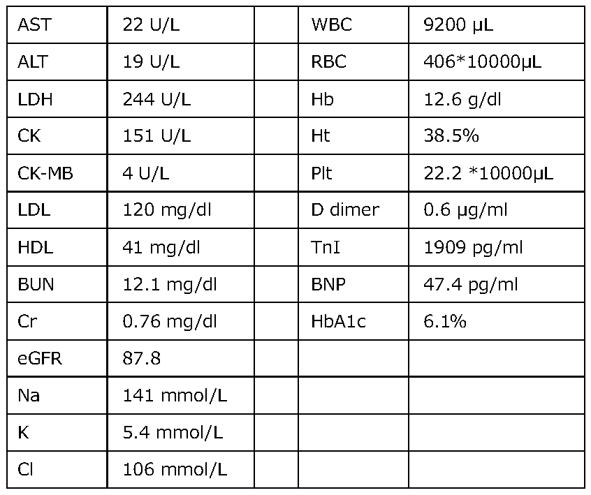 白血球の上昇、軽度の貧血、LDL値は正常であるが、若年女性としては若干高い傾向であった。CK・CK-MB・LDHの上昇を認め、TnTが陽性であった。